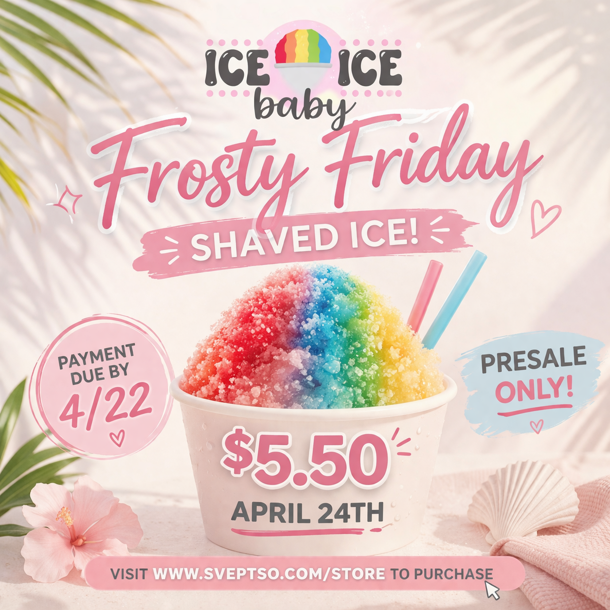 Prepay for April Frosty Friday. Frosty Friday will be on April 24th Presale ends 4/22